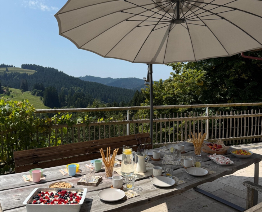 Auf der Terrasse oder im Garten lässt sich in den Pausen die Stille des Kreuzbachtals genießen – oder einfach der Blick in die Ferne schweifen lassen.