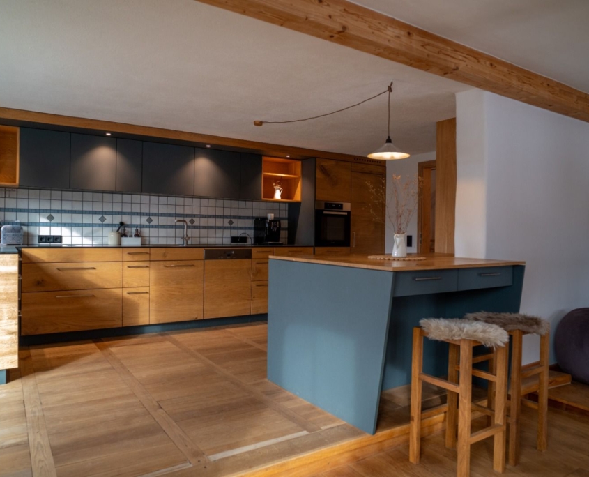 Die Einrichtung ist stilvoll, durchdacht und harmonisch aufeinander abgestimmt. Holz, Licht und natürliche Farben schaffen ein Gefühl von Geborgenheit und Klarheit.